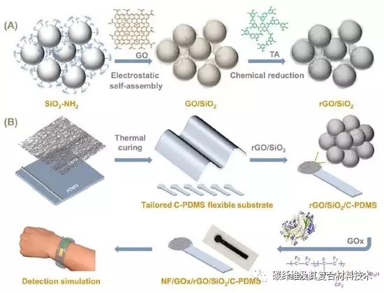 此外,它還可以引入更多的二次傳感材料,從而增強(qiáng)其多功能化能力。使用沉積在碳納米管(CNT)和PDMS復(fù)合基底上的rGO涂層二氧化硅(SiO2)納米球、葡萄糖氧化物和Nafion溶液檢測(cè)汗液中的葡萄糖。化學(xué)電阻氣體傳感器由rGO和氧化鋅(ZnO)納米棒制成。