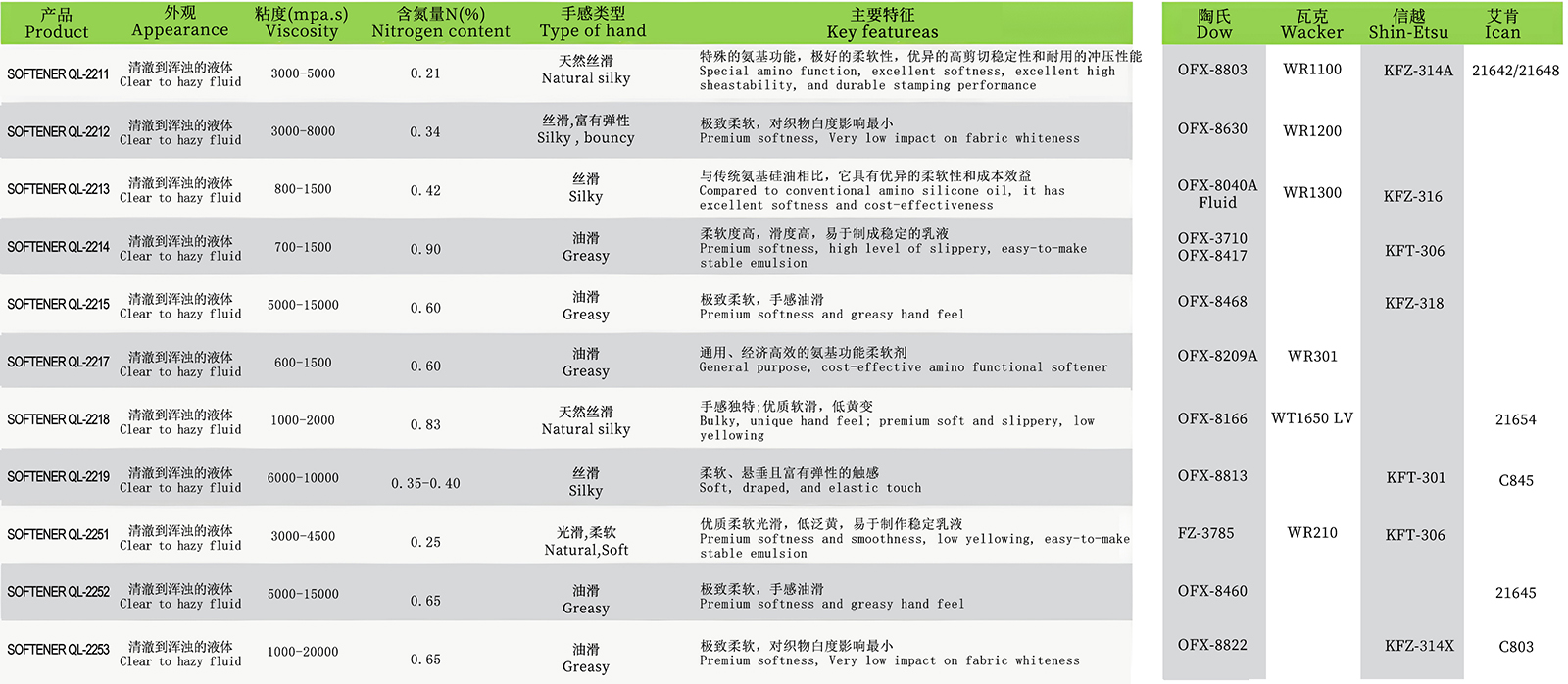- 強(qiáng)力化工QL-2211~2253:氨值 0.15~0.9 mmol/g,粘度覆蓋600~15000 mPa?s,適用于工業(yè)規(guī)?;a(chǎn)。