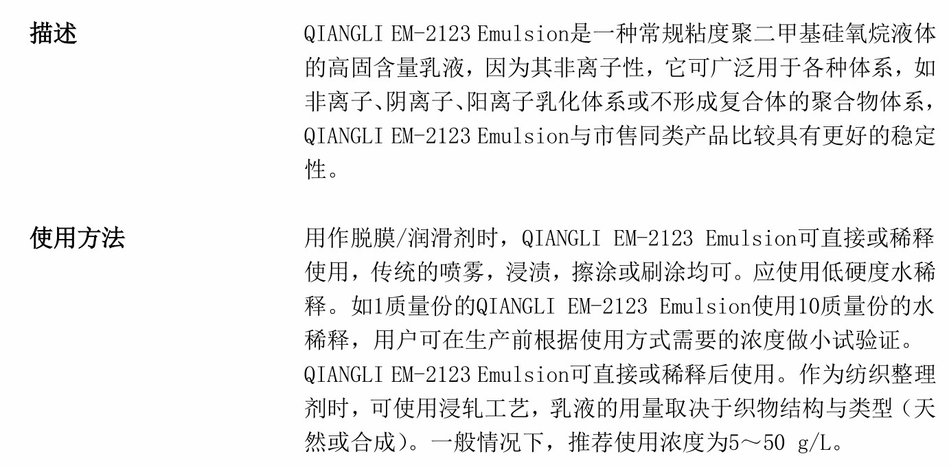 應(yīng)用 ? QIANGLI EM-2123 Emulsion 可作為拋光劑成分用于汽車和家具拋光
