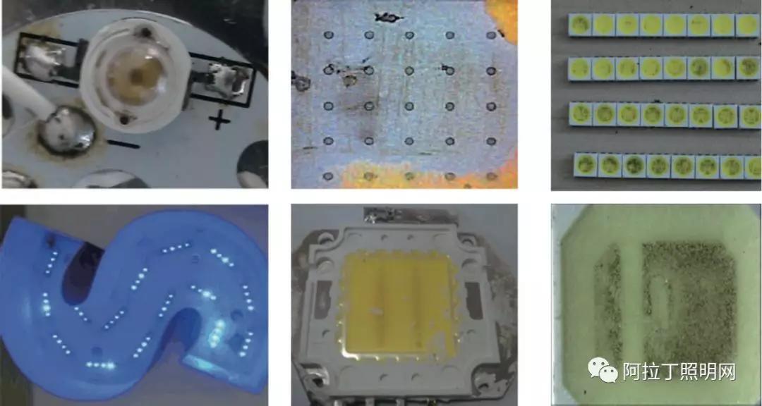 從圖一可以看到,不論燈珠形式,不論何種燈具,硫化發(fā)黑和鹵素發(fā)黑是LED終端經常會遇到一個問題,通常是LED支架反射銀層與環(huán)境中硫元素或者鹵素發(fā)生化學反應引起的外觀發(fā)黑,這種發(fā)黑通常不可逆,造成非常大的光衰。