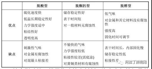 根據交聯(lián)反應生成的副產物種類,縮合型硅膠又可以細分為脫酸型、脫酮肟型、脫醇型、脫胺型、脫丙酮型、脫酰胺型等六種類型,常見的三類縮合型硅膠的優(yōu)缺點如下所示。