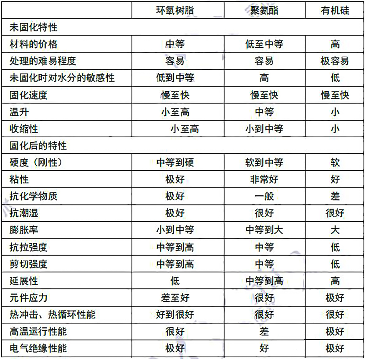 2 三種主要灌封膠的比較