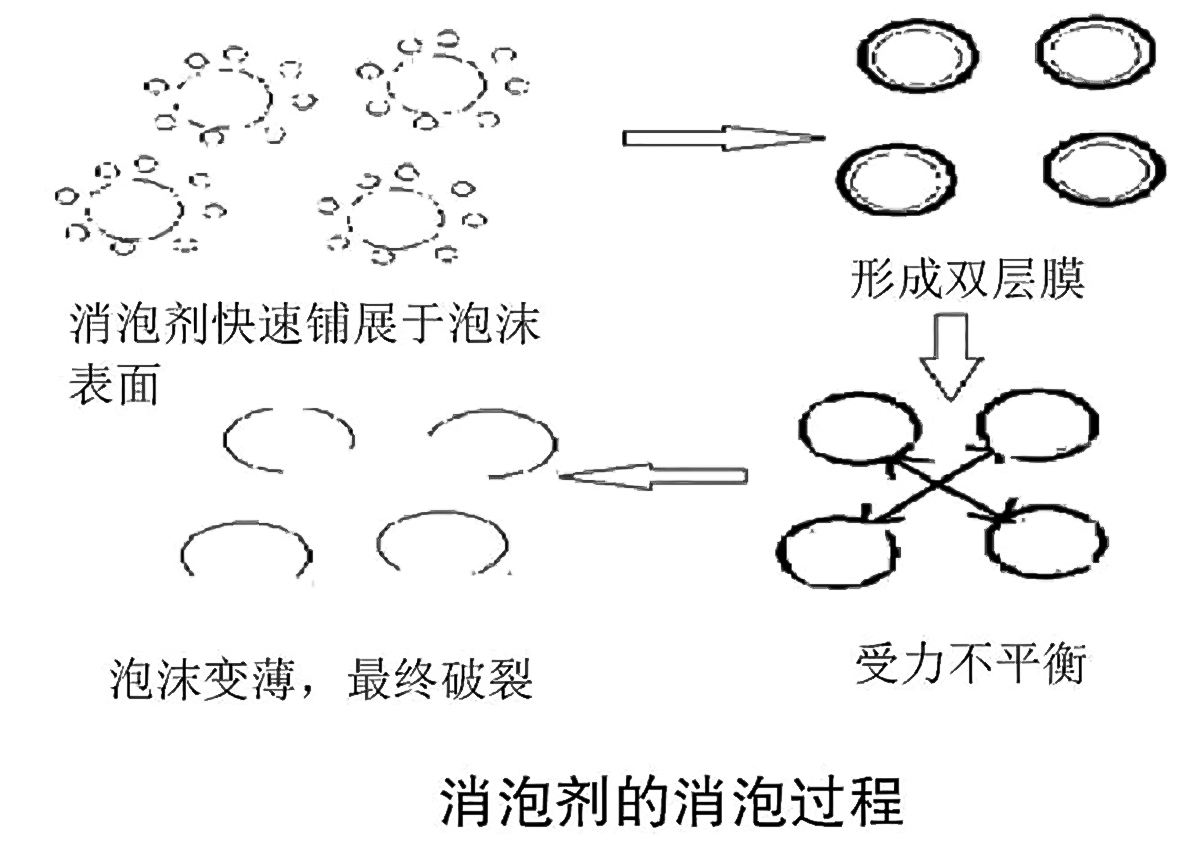 分散均勻的消泡劑滲透進(jìn)入泡沫薄層并且形成單分子膜,使其附著力降低,易于薄層破裂。