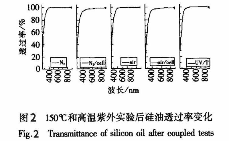1)85℃中以實驗前硅油為參比液,各實驗后硅油為測試液,得到以下光譜透過率曲線。實驗時間大于 800h 的硅油在300nm及以下波段透過率急劇下降。在考察時間內(nèi)由于硅電池對于400nm以前的光譜不響應,所以液浸于硅油中的硅電池人射光沒有削減。由于320nm 之前光譜透過率降低即液體的吸收增加,所以減少了入射到電池上的無效光,從而降低電池溫度。對于多結(jié)聚光電池光譜響應范圍擴展到 300~1800nm,用此液體液浸可能會造成微量的入射光損失。