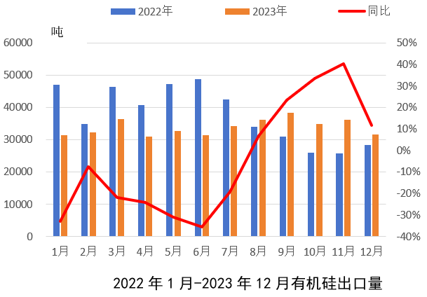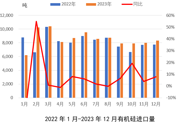 從進口量來看,2023年1-12月有機硅進口整體同比小幅增加5.1%。進口增加主要因為一方面因疫情管控放開國外高端有機硅產(chǎn)品進口有所恢復(fù),另一方面國外需求下滑,部分外企銷售重心轉(zhuǎn)向國內(nèi)市場。