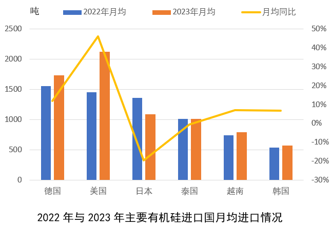 1.2023年1-12月,對美國和德國有機硅進口大幅增加,月均同比增加分別約46%與12%,美國重新成為我國最大有機硅進口國;