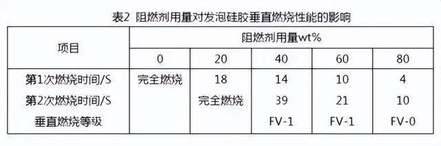 常用于表征聚合物阻燃性能之一的測試方法為垂直燃燒法,其燃燒模式非常接近物體燃燒的實(shí)際情況, 因此能很好地反映硅橡膠的實(shí)際阻燃效果。阻燃劑用量對硅橡膠垂直燃燒性能的影響如表2所示。從表2可以看出, 未加阻燃劑的硅橡膠完全燃燒;加入40份阻燃劑的硅橡膠垂直燃燒等級達(dá)到FV-1級, 具有一定的自熄能力;加入80 份阻燃劑的硅橡膠垂直燃燒等級更是達(dá)到了FV-0級, 表現(xiàn)出良好的自熄性。