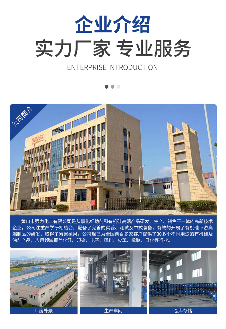 黃山市強(qiáng)力化工有限公司是一家專注于有機(jī)硅新材料,集研發(fā)、生產(chǎn)與銷售為一體的綜合性高新技術(shù)企業(yè)。公司已是有機(jī)硅行業(yè)內(nèi)較為知名的品牌,傾力于打造高品質(zhì)有機(jī)硅產(chǎn)品:二甲基硅油、乙烯基硅油、氨基硅油、乳化硅油、羥基硅油、含氫硅油與紡織品硅油等。砥礪前行,踔厲奮發(fā),強(qiáng)力純硅油,更高技術(shù),更好硅油。